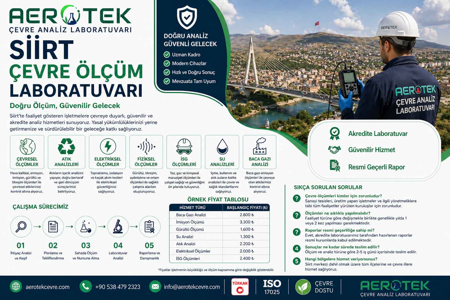 Siirt Çevre Ölçüm Laboratuvarı | Güvenilir Analiz ve Danışmanlık Hizmetleri Siirt’te faaliyet gösteren işletmeler için çevre ölçüm ve analiz hizmetleri, yasal yükümlülüklerin yerine getirilmesi ve çevreye duyarlı üretim süreçlerinin sürdürülebilmesi açısından büyük önem taşır. Siirt çevre ölçüm laboratuvarı hizmetleri kapsamında;